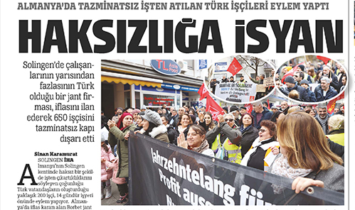 SOLINGEN İHA Almanya’nın Solingen  kentinde haksız bir şekilde işten çıkartıldıklarını  söyleyen çoğunluğu  Türk vatandaşların oluşturduğu  yaklaşık 200 işçi, 14 gündür işyeri  önünde eylem yapıyor. Almanya’da iflas kararı alan Borbet jant  firmasında çalışan işçiler, iflasın  hukuksuz olduğunu iddia ederek,  haklarını aramak için her gün  saat 13.00 ila 14.00 arasında işyeri  önünde firmayı protesto ediyor. Çalışanlarının yarısından  fazlasının Türk olduğu Borbet jant  firmasında işten çıkartılan işçi  sayısının ise 650 olduğu belirtiliyor. Yeni yıla işsiz girdiklerini  dile getiren işyeri işçi temsilciliği  üyesi Halit Bıçakçı, “Üretimlerimizi diğer şirketlerine yaydı.  Küçülerek kurtaracağım politikasına girdi ilk başta ama bilinçli bir  şekilde firmayı kapatmaya doğru  götürdü. İşçilere beş kuruş vermeden kapının önüne koydu, biz  tazminatımızı istiyoruz” diyerek  tepkisini dile getirdi. Borbet jant şirketinin işçi  ücretlerini düşürmek istediğini