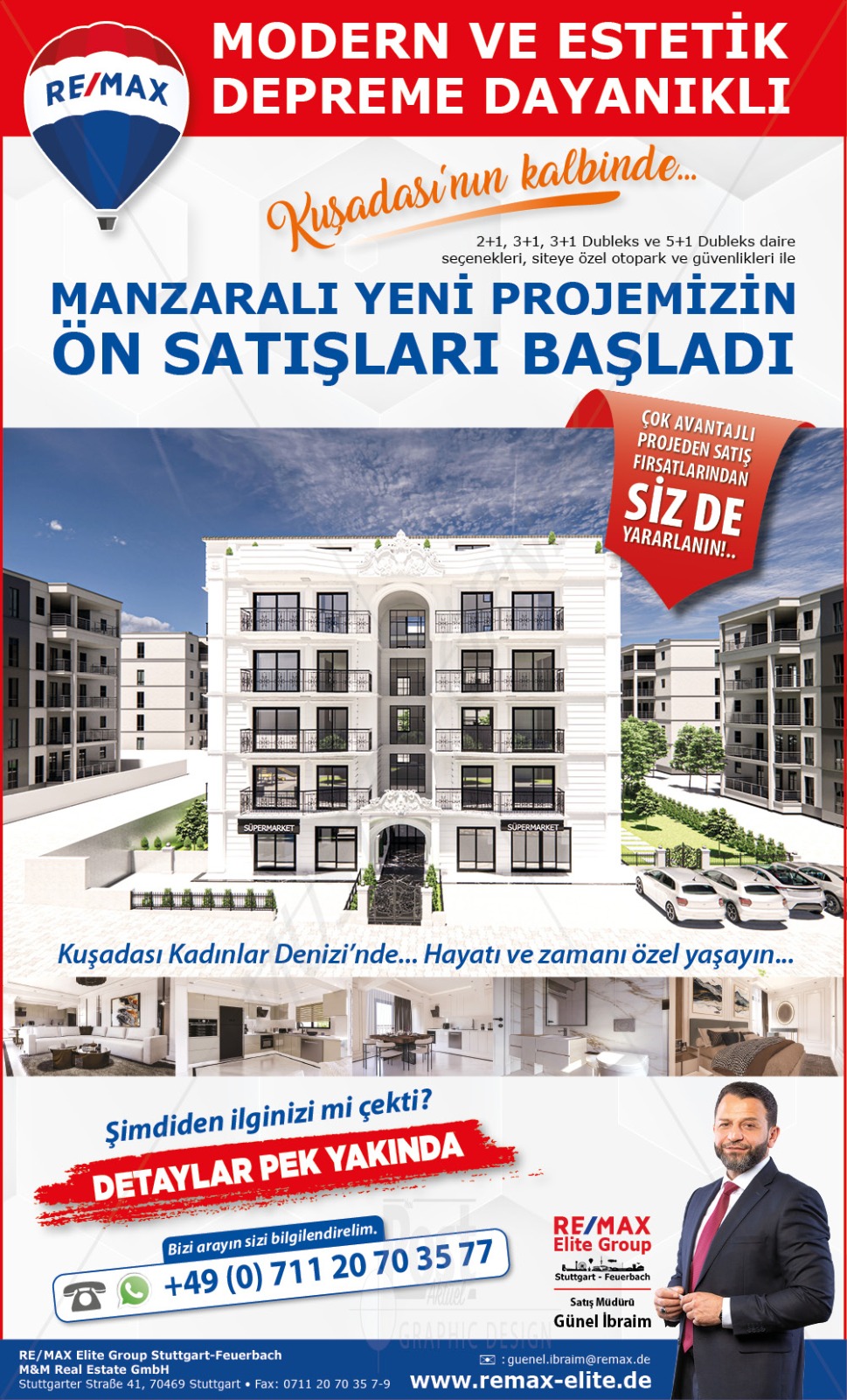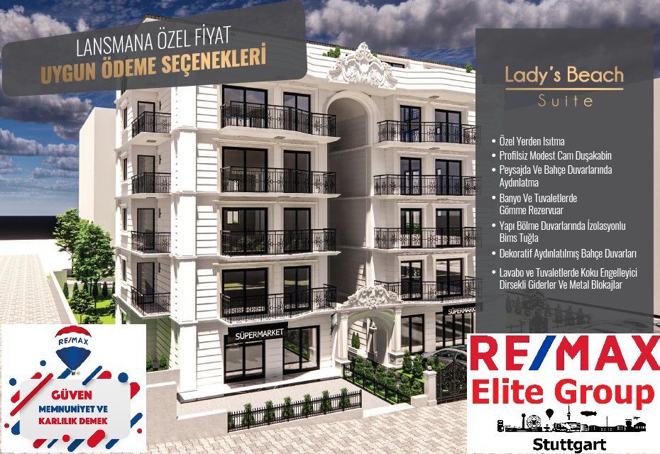 STUTTGART- Güvenilir, kaliteli, profesyonel, güçlü, paylaşımcı bir ekip ve yönetim kadrosuyla RE/MAX Elite Group Stuttgart ile zarafeti yaşayın. ‘FARKI BİZİMLE YAŞAYIN’ sloganı ile yola çıkan RE/MAX Elite Group Türkiye’de atılım hamlesi başlattı. Kuşadası Kadınlar Denizi’nde Lady’s Beach Suits projesini başlattı. Gelişimini büyük bir titizlikle benzersiz yatırım fırsatları doğacağını öngören RE/MAX Elite Group Türkiye’de örneği az bulunan bir şekilde tamamen sürdürülebilirlik anlayışıyla ve günün koşullarına ve beklentilerine uygun olarak hayata geçirmekte olunan Lady’s Beach Suits projesi ile satışlarına start verdi.