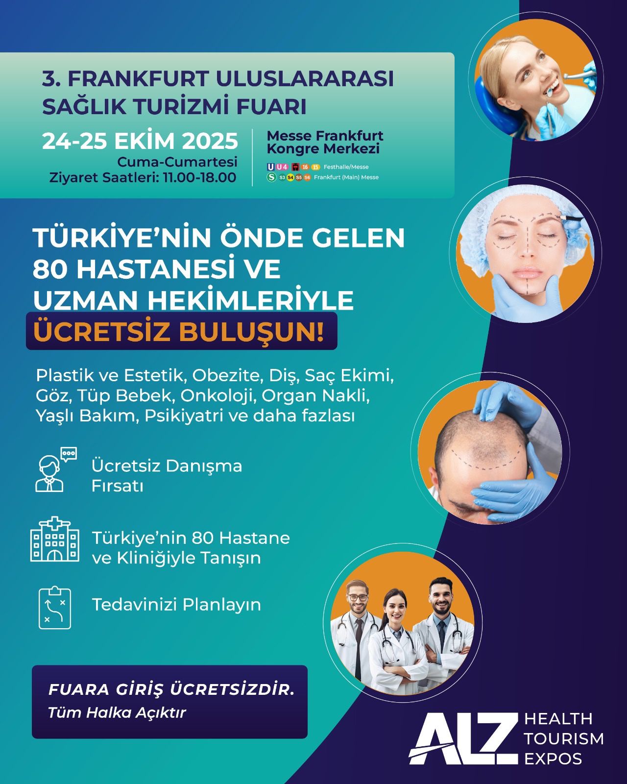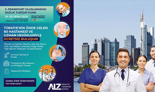 ALZ Grup tarafından düzenlenecek olan 3. Frankfurt Uluslararası Sağlık Turizmi Fuarı 24-25 Ekim 2025’de Messe Frankfurt’un Kongre Merkezi’nde açılacak. Girişi ücretsiz olacak şekilde planlanan fuara, önceki senelerde olduğu gibi sağlık ve estetik problemleri ile tedavileri hakkında bilgi almak isteyenlerin yoğun ilgi göstermesi bekleniyor.