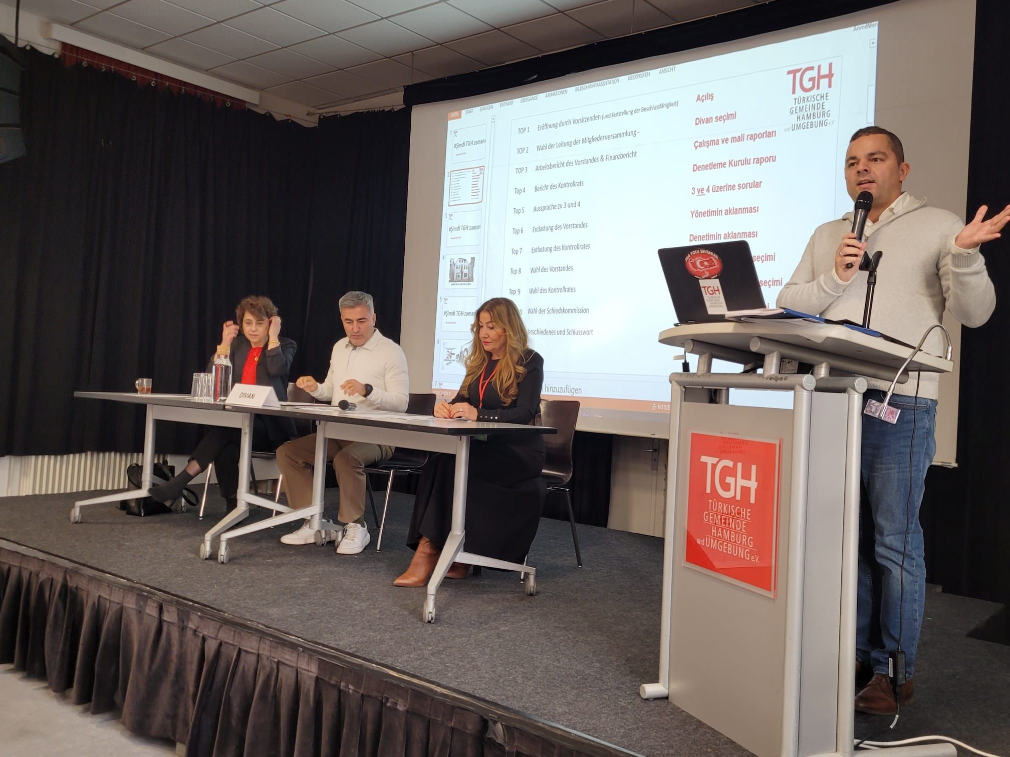 Hamburg ve Çevresi Türk Toplumu (TGH), 25 üye derneğin delegelerinin katılımıyla gerçekleştirdiği seçimli Genel Kurulla yeni yönetimini belirledi. Hamburg’da son dönemde hayatlarını kaybedenlerin anısına bir dakikalık saygı duruşuyla başlayan etkinliğe Hamburg Mitte İlçe Belediye Başkanı Ralf Neubauer de (SPD) katıldı. TGH Başkanı Murat Kaplan’ın TGH’yı kısa tanıtımının ardından Kemal Su, Elif Ergün ve Okşan Karakuş’tan oluşan Divan Kurulu belirlendi. Seçimden önce söz alan Neubauer, ayrışmanın giderek arttığı toplumumuzda TGH gibi farklı kültürleri bir araya getiren sivil toplum kuruluşlarının önemine dikkat çekti. TGH’ın önümüzdeki yıllarda Mümmelmansberg semtinde faaliyete sokmayı planladığı Saylan Evi projesine değinen Neubauer, herkese açık olacak, kültürel çeşitliliği, uyumu ve eğitimi destekleyecek olan bu projeye destek vermeye devam edeceklerini de ifade etti. Çalışma, mali ve denetleme raporlarının okunmasının ardından eski yönetim aklandı. Kapalı oylama ile yapılan seçimlerin ardından tek aday Murat Kaplan 90 ‘evet ve bir çekimser oyla yeniden başkan seçildi. Kaplan, gelecek dönemde çalışmak istediği isimleri de açıklayarak delegelerden destek istedi. Seçimlerde Hülya Çağrı (76 oy) ve Derya Tüncel (89 oy) başkan yardımcılığına seçilirken Ahmet İnci 90 oyla yeniden sayman seçildi. Ayhan İlhan, Gülcihan Özdemir, Aynur Deniz Sunal, Eda Ünlü ve Bahadır Köksal yönetim kurulu asil üyeliğine, Azmi Akgül, Selim Kavcıoğlu ve Rakıp Ayhan yedek üyeliğe seçildi. Denetleme Kuruluna Olgay Sadak, Ali Kurtuldu ve Namık Yener seçilirken Mesut Sipahi ve Recep Kaprol yedek üye oldu. Şuayip Karakuş, Şenay Gemici ve Engin Birsen Çelik Tahkim Kurulu asil üyeleri, Murat Comart ve Mehmet Serdar Temur yedek üye seçildiler. Kendisine ve yönetime duydukları güven ve verdikleri güçlü destek için teşekkür eden başkan Murat Kaplan, toplumda daha fazla iletişim ağının kurulmasına odaklanacaklarını, sosyal hizmetler, uyum ve katılım alanlarındaki çalışmalarını gelecekte de sürdüreceklerini ifade etti. TGH yönetiminde bu kez gençlerin sayısının artışı sevindirici bir gelişme oldu. Toplantıya TGH’nın kurucularından Prof. Dr. Hakkı Keskin de katıldı.