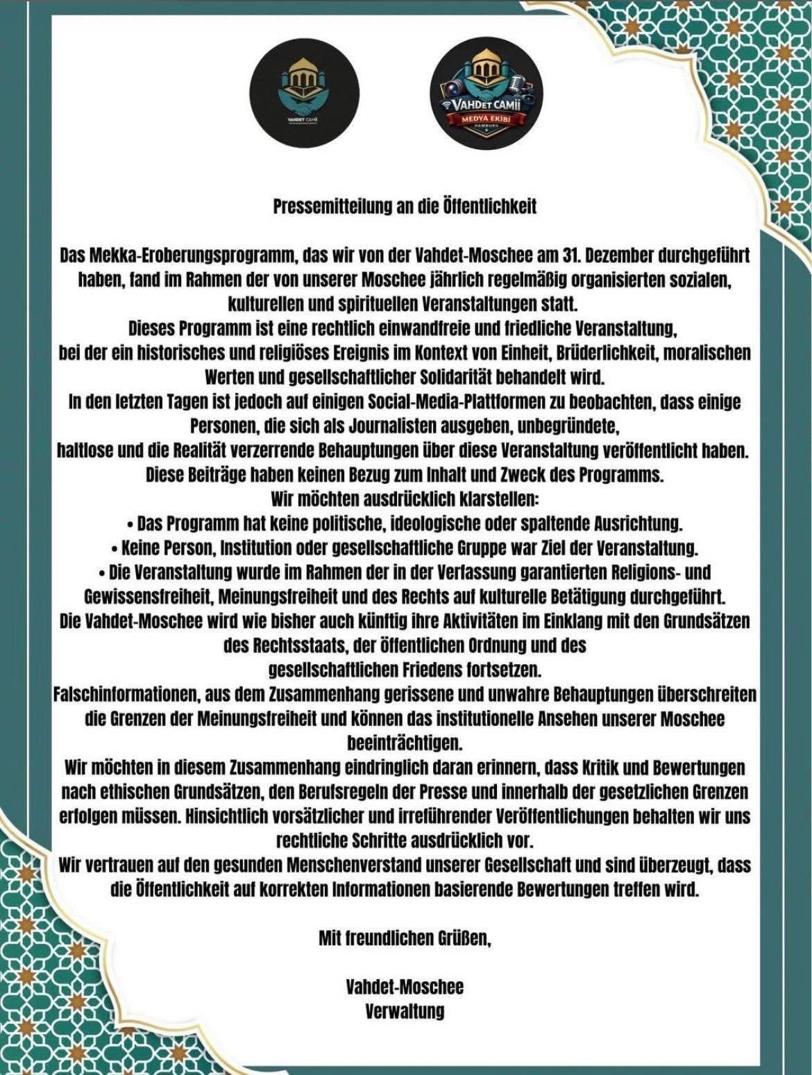 Öte yandan Vahdet Camii yaptığı basın açıklamasında ise, 31 Aralık’ta gerçekleştirilen “Mekke’nin Fethi Programı”nın cami bünyesinde her yıl düzenlenen sosyal, kültürel ve manevi faaliyetler kapsamında yapıldığını belirtti. Programın tarihsel ve dini bir olayın birlik, kardeşlik, ahlaki değerler ve toplumsal dayanışma çerçevesinde ele alındığı, hukuka uygun ve barışçıl bir etkinlik olduğu vurgulandı. Cami yönetimi, son günlerde kendilerini gazeteci olarak tanıtan bazı kişiler tarafından sosyal medyada yayılan iddiaların asılsız, mesnetsiz ve bağlamından koparılmış olduğunu belirterek şu ifadelere yer verdi: “Bu paylaşımların programın içeriği ve amacıyla hiçbir ilgisi yoktur. Programın hiçbir siyasi, ideolojik veya ayrıştırıcı yönü bulunmamaktadır.”