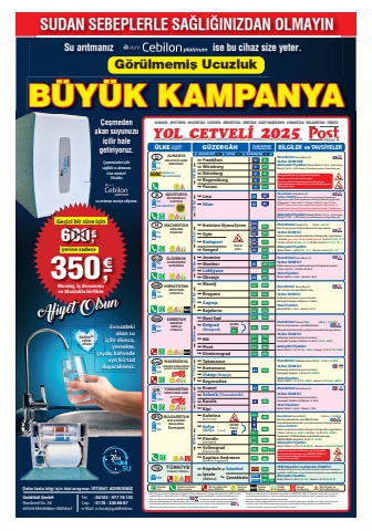 Goldfeld GmbHNordend Str. 3864546-M%u00f6rfelden-WalldorfTel. : 06105 - 977 78 135Cep : 0178 - 220 88 87e-Mail : n.furat@goldfeld.euDaha fazla bilgi i%u00e7in bizi aray%u0131n%u0131z: %u0130RT%u0130BAT ADRES%u0130M%u0130ZKalbinizrahatolsunSUDAN SEBEPLERLE SA%u011eLI%u011eINIZDAN OLMAYINSu ar%u0131tman%u0131z ise bu cihaz size yeter.%u00c7e%u015fmeden akan suyunuzui%u00e7ilir hale getiriyoruz.Evinizdeki akan su i%u00e7ilir olunca, yemekte, %u00e7ayda, kahvede ayr%u0131 bir tad duyacaks%u0131n%u0131z.B%u00dcY%u00dcK KAMPANYA%u0130kaz %u00dc%u00e7geni ve %u0130lk Yard%u0131m Kutusu%u00c7ekme Halat%u0131G%u00fcnd%u00fczFar%u0131EmniyetYele%u011fiAB d%u0131%u015f%u0131 %u00fclkelerdeilave %u00dcCRETL%u0130Telefon tarifeleriilave %u00fccretsizYang%u0131n S%u00f6nd%u00fcr%u00fcc%u00fcYedek Amp%u00fclTR T%u00dcRK%u0130YETURKEI/TURKEY112TEM Otoyallar%u0131 ve K%u00f6pr%u00fcler %u00dcCRETL%u0130Genelde H%u0131zl%u0131 Ge%u00e7i%u015f Sistemi (HGS) kart%u0131 ile ge%u00e7ilir. (HGS kart%u0131 olmadan da ge%u00e7ilebilir ve HGS kart%u0131n%u0131 14 g%u00fcn i%u00e7inde postanelerden cezas%u0131z alabilirsiniz)Akaryak%u0131t Fiyatlar%u0131Mazot (Dizel ) 1,09 %u20ac (49,7 ) %u2013 Benzin 1,07 %u20ac (48,70 )Kap%u0131kule%u0130psala(Edirne)%u0130stanbul%u00c7anakkaleE80E87 E90D.100 E84D.5500.3YOL CETVEL%u0130 2025BG BULGAR%u0130STANBULGARIENBULGARIAPara Birimi: Leva (BGN) 1,00 %u20ac = 1,96 BGNKart ile %u00f6demelerde %u00e7ok dikkatli olun.G%u00fcmr%u00fck bankalar%u0131ndan yerli para al%u0131nmas%u0131 tavsiye olunur. Yollar%u0131 %u00dcCRETL%u0130:Plaka numaras%u0131na elektronik kay%u0131t (E-Vignette) uygulamas%u0131. 7 G%u00fcn: 7,67 %u20ac (15,- BGN ) / 30 G%u00fcn: 15,34 %u20ac (30,- BGN )Cuma saat 12:00 ile Pazar saat 23:59 aras%u0131 i%u00e7inHAFTA SONU vinyeti: 5,12 %u20ac (10,- BGN )Akaryak%u0131t Fiyatlar%u0131Mazot (Dizel ) 1,22 %u20ac (2,39 BGN ) %u2013 Benzin 1,24 %u20ac (2,43 BGN )%u00c7EVRE YOLUKapitan AndreevoSvilengradPlovdivKalotinaSofya(Sofya - )360 km88E80E80E80E80E80E85A1A6A1A4A4A41818112146Bulgaristan giri%u015fi hudut kap%u0131s%u0131 in%u015faat%u0131 ve giri%u015ften sonra iki hudut ile Sofya aras%u0131 AVRUPA OTOYOLU in%u015faat%u0131 devam ediyor. Ge%u00e7i%u015fler yer yer in%u015faat alanlar%u0131ndan veriliyor.%u2022 AVRO (%u20ac) para birimini kullanmayan %u00fclkelerde (%u00c7ekya, Macaristan, S%u0131rbistan ve Bulgaristan) AVRO ile %u00f6demelerde %50 ye varan fark al%u0131n%u0131yor! AVRO%u2019yu kabul etmek zorunda de%u011filler, hukuken de hakk%u0131m%u0131z yok.%u2022 %u00c7ekya ve Macaristan%u2019da kredi yada debit kart%u0131 ile yerel para %u00fczerinden %u00f6deme yap%u0131labilinir.%u2022 S%u0131rbistan ve Bulgaristan%u2019da ihtiyaca g%u00f6re (yak%u0131t, yol %u00fccreti, vs. i%u00e7in) para bozdurulmas%u0131 tavsiye olunur. Hudutlardaki g%u00fcmr%u00fck bankalar%u0131nda d%u00f6viz komisyonu %3 ile %5 aras%u0131. Kredi yada debit kart%u0131 %u00f6demelerinde paran%u0131n birimini ve miktar%u0131n%u0131 %u00f6nce kontrol edin sonra onaylay%u0131n.%u2022 Tan%u0131d%u0131k ve kalabal%u0131k park ve akaryak%u0131t istasyonlar%u0131n%u0131 (GAZPROM, OMV ve Shell gibi) tercih edin ve yerinizi gurbet%u00e7ilerin yan%u0131nda se%u00e7in! Arac%u0131n%u0131z%u0131n d%u0131%u015far%u0131dan g%u00f6r%u00fclebilecek yerlerine %u00e7anta, pasaport, para, telefon, laptop ve benzeri de%u011ferli e%u015fyalar%u0131n%u0131z%u0131 koymay%u0131n.%u2022 Vinyetleri %u00fclkerin giri%u015finde belirlenen resm%u00ee sat%u0131%u015f noktalar%u0131ndan temin edebilirsiniz. Di%u011fer sat%u0131%u015f yerlerinde %u00fccretleri zaml%u0131 olur. Plaka numaralar%u0131n%u0131n yan%u0131s%u0131ra arac%u0131n kay%u0131tl%u0131 oldu%u011fu %u00fclke koduna da dikkat edin. 1 G%u00fcnl%u00fck vinyetler o g%u00fcn gece saat 23:59 a kadar ge%u00e7erli!SRB SIRB%u0130STANSERBIENSRBIJACP6 JAPara Birimi: Dinar (RSD) 1,00 %u20ac = 117 RSDKart ile %u00f6demelerde %u00e7ok dikkatli olun.G%u00fcmr%u00fck bankalar%u0131ndan yerli para al%u0131nmas%u0131 tavsiye olunur. Yollar%u0131 %u00dcCRETL%u0130Kullan%u0131lan hat birimi i%u00e7in %u00fccret al%u0131n%u0131r.G%u00fczerg%u00e2h Toplam%u0131 Ortalam: 21,50 %u20ac (2.516,- RSD )Akaryak%u0131t Fiyatlar%u0131Mazot (Dizel ) 1,61 %u20ac (188,- RSD ) %u2013 Benzin 1,53 %u20ac (179,- RSD )DimitrovgradPirotNi%u0161Novi Sad540 kmE80A1 E75A4E80E80A4A4A1 E75A1A1 E75112987Belgrad(Beograd)%u00c7EVRE YOLUMACAR%u0130STANUNGARNMAGYARPara Birimi: Forint (Ft.) 1,00 %u20ac = 403 Ft.Kart ile yerel para birimi %u00f6demesi tavsiye olunur. Yollar%u0131 %u00dcCRETL%u0130Plaka numaras%u0131na elektronik kay%u0131t (E-Vignette) uygulamas%u0131.1 G%u00fcnl%u00fck gece saat 23:59'a kadar ge%u00e7erli: 16,20 %u20ac (6.529,- Ft. )10 G%u00fcn: 20,00 %u20ac (8.060,- Ft. ) / 30 G%u00fcn: 32,30 %u20ac (13.017,- Ft. )Akaryak%u0131t Fiyatlar%u0131Szeged Mazot (Dizel ) 1,68 %u20ac (677,- Ft. ) %u2013 Benzin 1,69 %u20ac (681,- Ft. )BudapestBratislava-Viyana Ayr%u0131m%u0131Gy%u00f6r 365 kmE75E75E75E75M5M5M15M1M1M1112188HTRAF%u0130KAKICISLO SLOVENYASLOWENIENSLOVENIAPara Birimi: Avro/Euro (%u20ac) Yollar%u0131 %u00dcCRETL%u0130Plaka numaras%u0131na elektronik kay%u0131t (E-Vignette) yap%u0131l%u0131r.7 G%u00fcn: 24,95 %u20ac - 30 G%u00fcn: 40,95 %u20acYak%u0131t Fiyatlar%u0131Obrezje Mazot (Nafta ) 1,46 %u20ac %u2013 Benzin 1,45 %u20acLubliyanaJeseniceMaribor 180 kmE59 E57E61E61E61A1A21121987HIRVAT%u0130STANKROATIENCROATIAPara Birimi: Avro/Euro (%u20ac)Kart ile %u00f6demelerde dikkatli olun.Yollar%u0131 %u00dcCRETL%u0130Kullan%u0131lan hat birimi i%u00e7in %u00fccret al%u0131n%u0131r.G%u00fczerg%u00e2h Toplam%u0131 Ortalama: 18,60 %u20ac Yak%u0131t Fiyatlar%u0131Mazot (Dizel ) 1,42 %u20ac %u2013 Benzin 1,47 %u20ac Bajakovo ZagrepMaceljBregana 310 kmE70E70E70HR E591121987A2A3A3A3AVUSTURYA%u00d6STERREICHAUSTRIAPara Birimi: Avro/Euro (%u20ac) Yollar%u0131 %u00dcCRETL%u0130 Se%u00e7enekli; arac%u0131n cam%u0131na pul yap%u0131%u015ft%u0131rma uygulamas%u0131 yada Plaka numaras%u0131na elekt