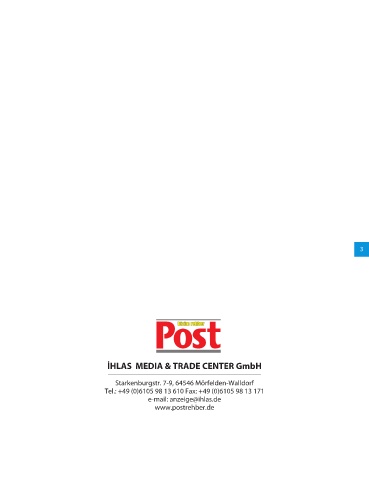 3 İhlas MedIa & Trade CenTer Gmbh Starkenburgstr. 7-9, 64546 Mörfelden-Walldorf Tel.: +49 (0)6105 98 13 610 Fax: +49 (0)6105 98 13 171 e-mail: anzeige@ihlas.de www.postrehber.de Post_Bizim_Rehber_BW_3-51.indd 3 14.11.12 22:07