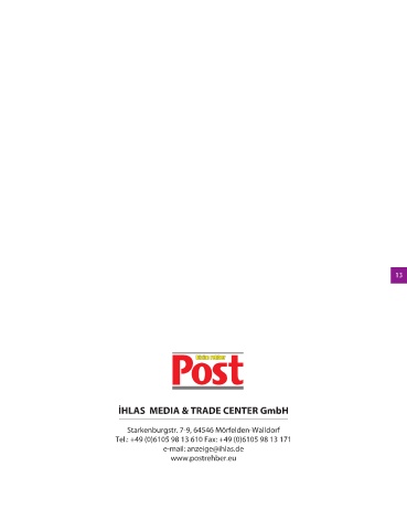 13 İhlas MedIa & Trade CenTer Gmbh Starkenburgstr. 7-9, 64546 Mörfelden-Walldorf Tel.: +49 (0)6105 98 13 610 Fax: +49 (0)6105 98 13 171 e-mail: anzeige@ihlas.de www.postrehber.eu Post_Bizim_Rehber_Schweiz_7-19_2013.indd 13 29.04.13 20:04