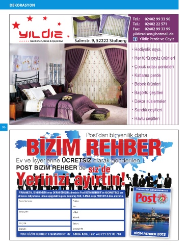 POST BİZİM REHBER: Frankfurterstr. 82, 51065 Köln, Fax: +49 221 222 05 713 BİZİM REHBER 2013