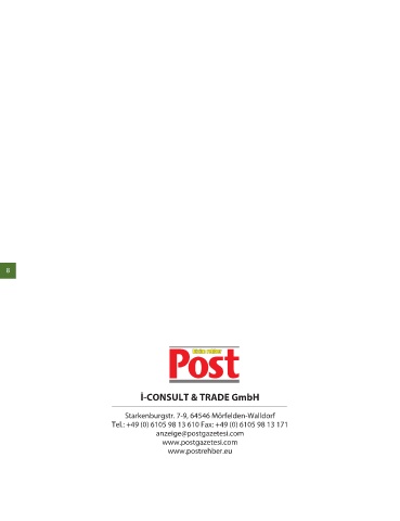 8 i-Consult & trade GmbH Starkenburgstr. 7-9, 64546 Mörfelden-Walldorf Tel.: +49 (0) 6105 98 13 610 Fax: +49 (0) 6105 98 13 171 anzeige@postgazetesi.com www.postgazetesi.com www.postrehber.eu Post_Bizim_Rehb_2015_Hamburg_3-43.indd 8 10.05.15 20:00