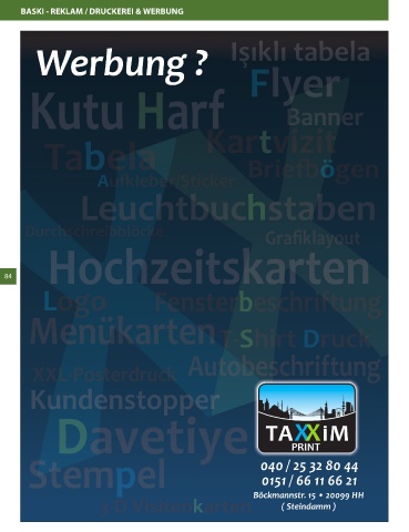 BASKI - REKLAM / DRUCKEREI & WERBUNG • Poster Baskısı • Iş klı tabela • 3 Boyutlu kartvizit • Kutu Harf 84 Post Bizim Rehber Hamburg Seite 84 10.05.2015 20:39:27