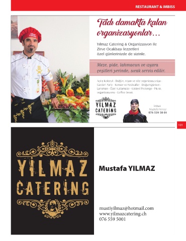 RESTAURANT & IMBISS 101 Mustafa YILMAZ mustiyilmaz@hotmail.com www.yilmazcatering.ch 076 559 5001 Post Bizim Rehber Isvicre Seite 101 24.04.2018 00:29:13