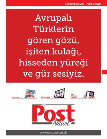 SÜRÜCÜ KURSLARI - FAHRSCHULEN Avrupalı Türklerin gören gözü, işiten kulağı, hisseden yüreği ve gür sesiyiz. 131 AVRUPA‘DA YAYINLANAN www.postgazetesi.ch AYLIK TÜRKÇE GAZETE Post Bizim Rehber Isvicre Seite 131 24.04.2018 00:31:02 MEDYA BİLGİ REHBERİ